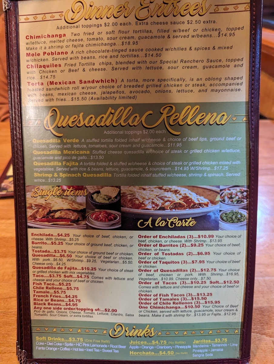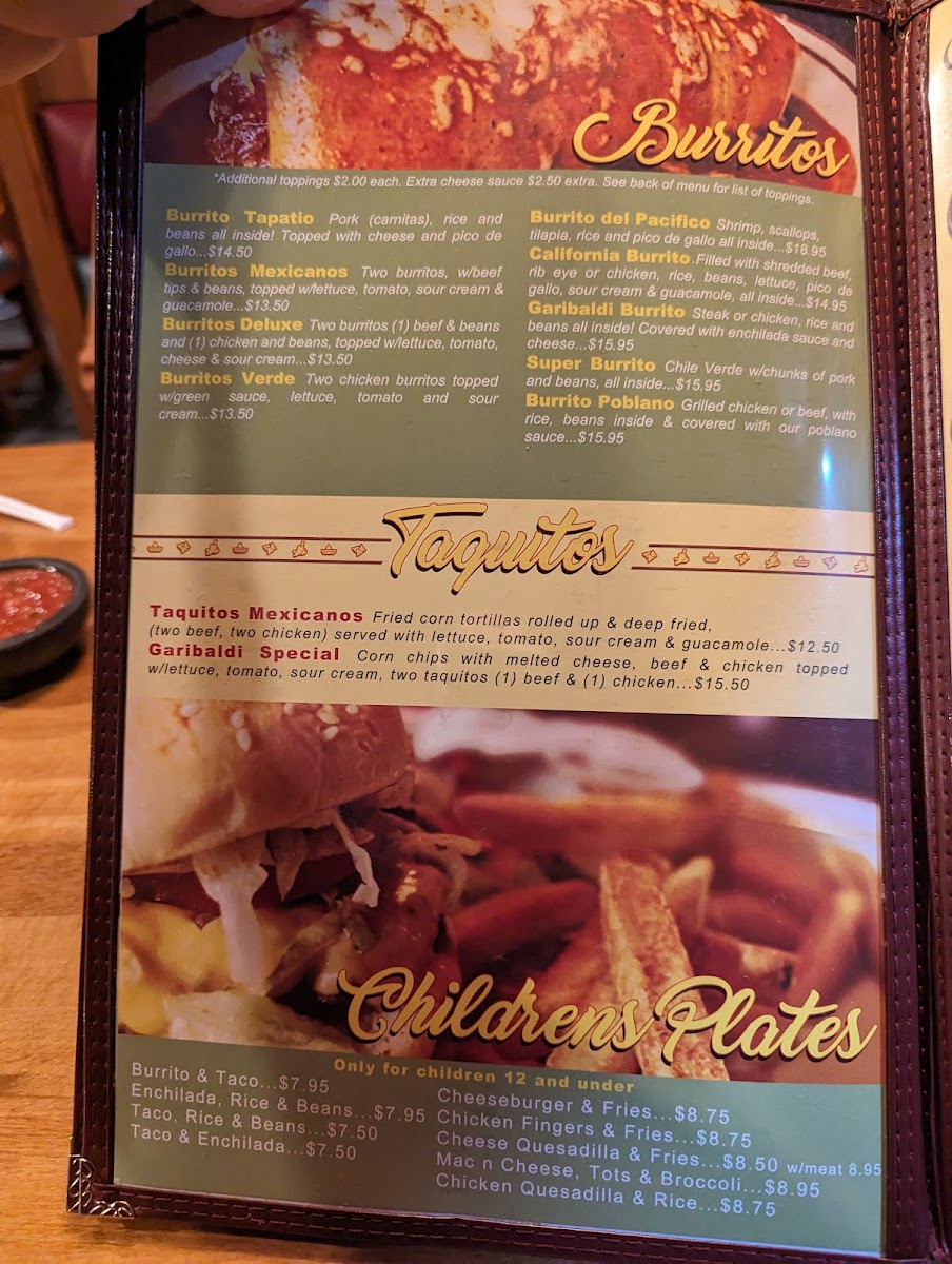 Highlights include the hearty California Burrito stuffed with shredded beef or grilled chicken, complemented by rice, beans, and fresh toppings, all for just $16.45. For those craving something richer, the Steak Jalisco delivers a succulent T-bone steak adorned with onions and bell peppers—a true feast for $21.95.